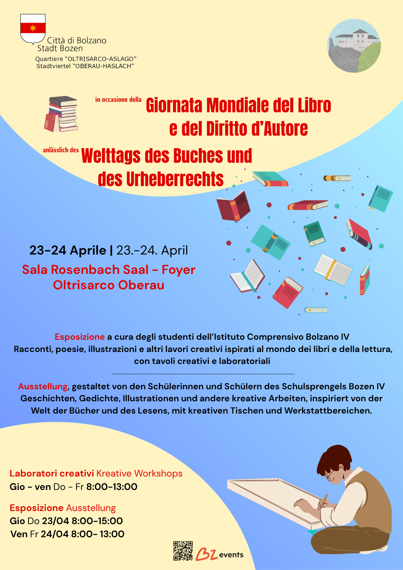 Der Stadtteil Oberau-Haslach organisiert am 23. und 24. April anlässlich des Welttages des Buches und des Urheberrechts eine Veranstaltung, die der Kreativität und der Freude am Lesen gewidmet ist. Dabei werden Arbeiten von Schülerinnen und Schülern des Schulsprengels Bozen IV ausgestellt, die in den Räumlichkeiten der Stadtviertelverwaltung präsentiert werden.