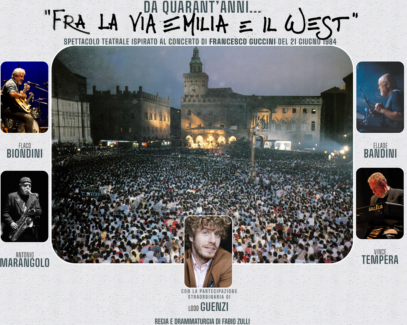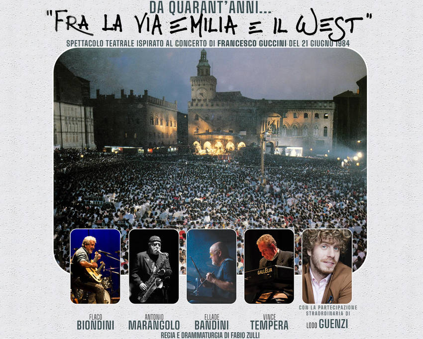 Vierzig Jahre nach dem legendären Konzert vom 21. Juni 1984 auf der Piazza Maggiore in Bologna bringen die Musiker von Guccini die Emotionen von „Fra la via Emilia e il West“ wieder auf die Bühne – einem der ikonischsten Live-Alben der italienischen Liedermacherszene. Flaco Biondini, Vince Tempera, Ellade Bandini und Antonio Marangolo – die Protagonisten dieses unvergesslichen Ereignisses – kommen erneut zusammen, um dem Publikum eine Show zu bieten, die Musik, Worte und Erinnerungen miteinander verknüpft.