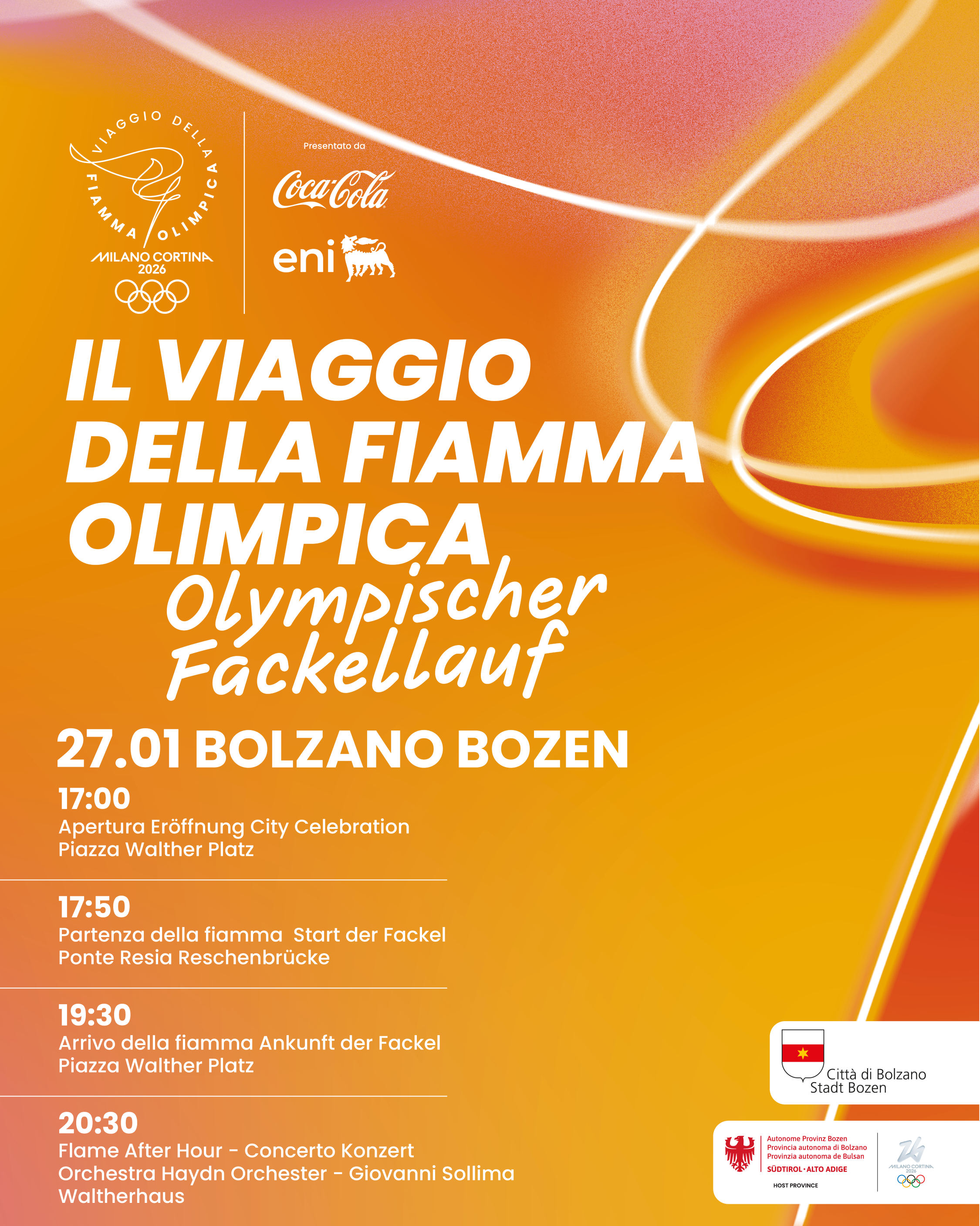 Die 51. Etappe des Olympischen Fackellaufs endet in Bozen mit einem festlichen Abend, der der gesamten Bevölkerung offensteht. Das historische Stadtzentrum verwandelt sich dabei in eine große Bühne, die den olympischen Werten gewidmet ist – mit Musik, Kunst und eindrucksvollen Darbietungen.