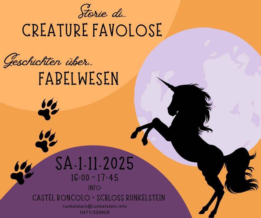 In den Räumen von Schloss Runkelstein, sieht man nicht nur Hündchen oder Waldtiere abgebildet. Aus den Pinseln der Künstler, sind auch Tiere aus fernen Ländern und Fabelwesen entstanden, die menschliche und tierische Eigenschaften in sich vereinen. Während des Rundganges durch das Schloss, werden Geschichten erzählt, mit einem Hauch von Schauer und Magie. Zusammen werden wir auf die Jagd nach diesen Einhörnern, Drachen und Monstern gehen und erfinden gemeinsam neue spannende Geschichten, die noch nie erzählt wurden...Mit Marina Mascher (Verein Ulrich von Starkenberg) und Margret Bergmann