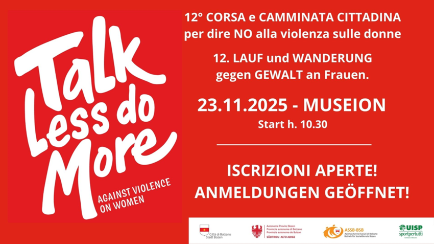 Auch dieses Jahr findet wieder der traditionelle Lauf gegen Gewalt an Frauen statt, der von der Stadt Bozen in Zusammenarbeit mit dem Betrieb für Sozialdienste Bozen und UISP Bozen organisiert wird.